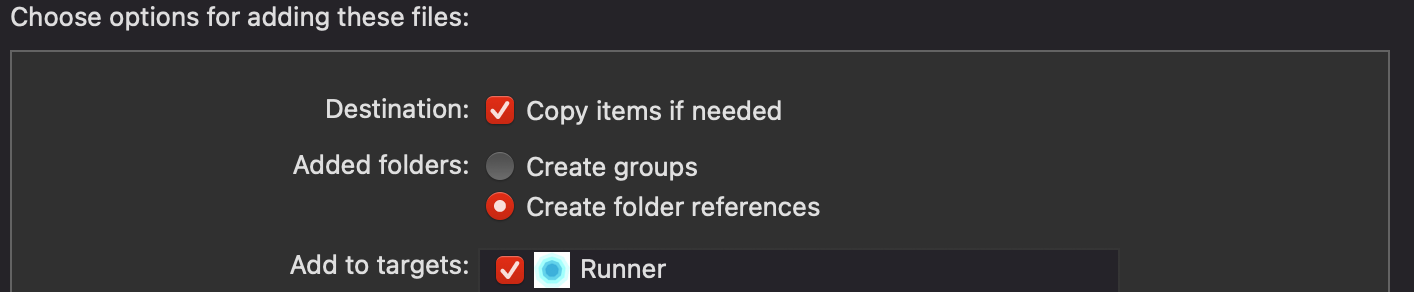 Right-click your Xcode project's root and add a New Group called Framework. This is where the frameworks will be added. When the group is created, drag and drop the dedicated extracted xcframework folders from Finder into the newly created group. A dialog will open, please select Copy items if needed, Create folder references and select the targets you want to add the Framework onto.