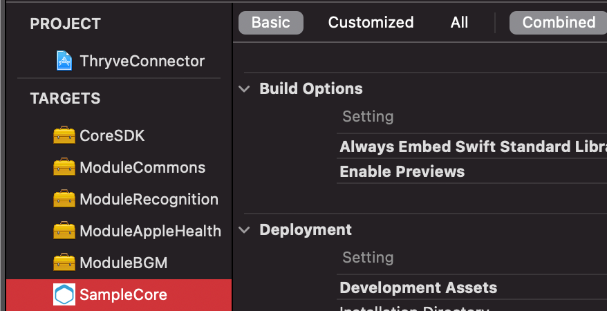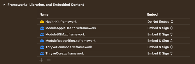 Next, add the framework in the Embedded Binaries and Linked Frameworks and Libraries sections by clicking on the +-sign. Select for example the ThryveCore.xcframework in the appearing dialog.